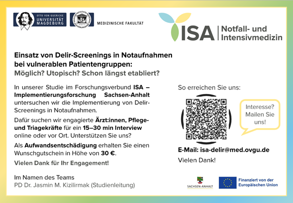 Unsere Studie „Implementierung von Delir-Screenings in Notaufnahmen in Nord-Sachsen-Anhalt“ startet ihre Phase der Datenerhebung. Dazu werden Interviews mit Ärzt:innen und Pflegepersonal geführt, die in der Notaufnahme tätig sind. Dadurch wollen wir verstehen, ob und wieDelir-Screenings in der Notaufnahme Anwendung finden. Falls Sie in der Notaufnahme tätig sind und daran interessiert sind, uns bei dieser Aufgabe zu unterstützen, können Sie sich gerne bei uns melden.