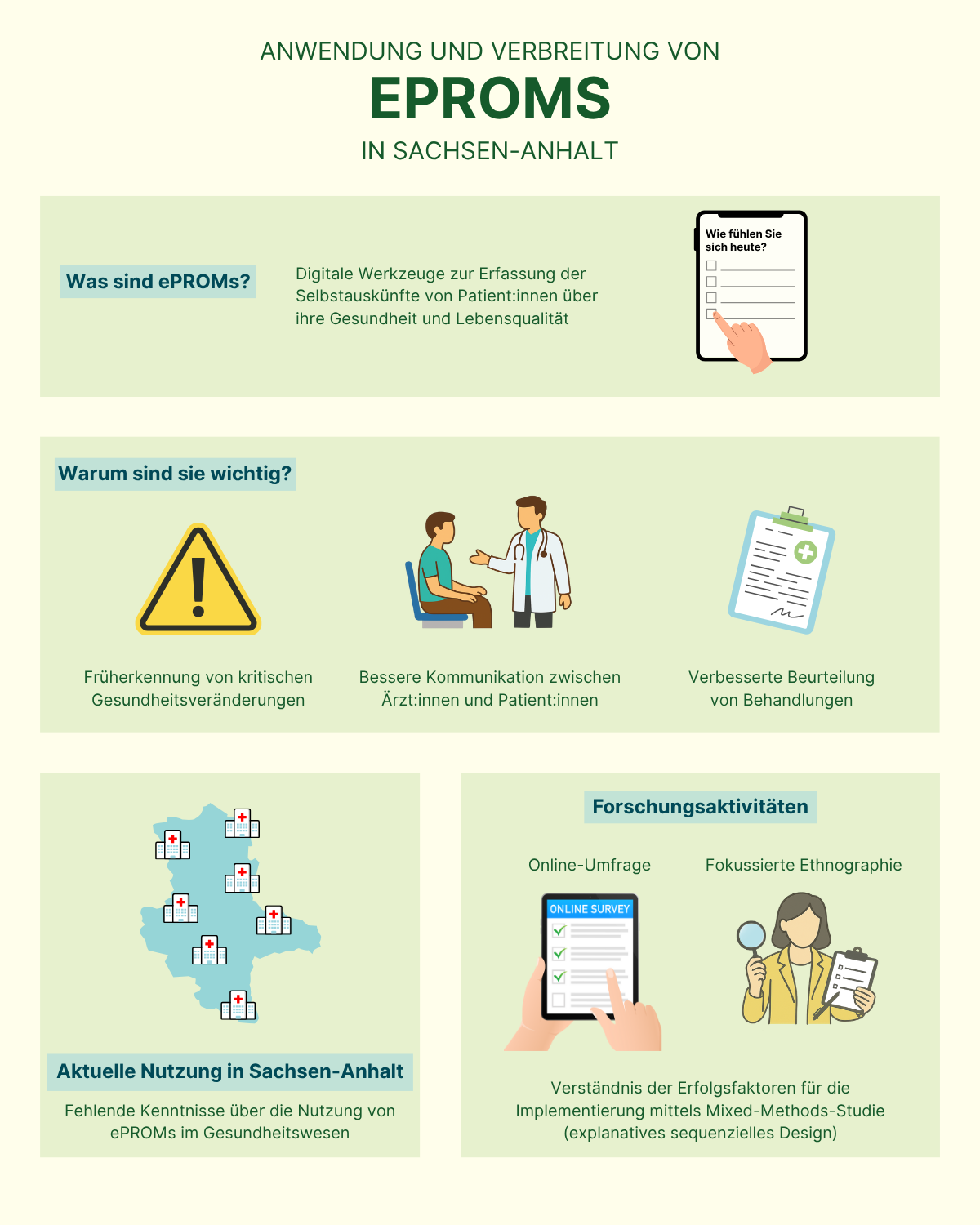 Bislang werden Patient:innenberichte in Kliniken jedoch nur unregelmäßig – in schriftlicher, mündlicher oder elektronischer Form – erhoben. Um die Voraussetzungen für eine systematische und breit angelegte Anwendung von ePROMs zu schaffen, ist zunächst eine Bestandsaufnahme erforderlich, die den aktuellen Stand der Nutzung ermittelt. Eine anschließende Beobachtungsstudie (fokussierte Ethnografie) soll vertiefende Einblicke in erfolgreiche und weniger erfolgreiche Umsetzungen von PROMs/ePROMs liefern.